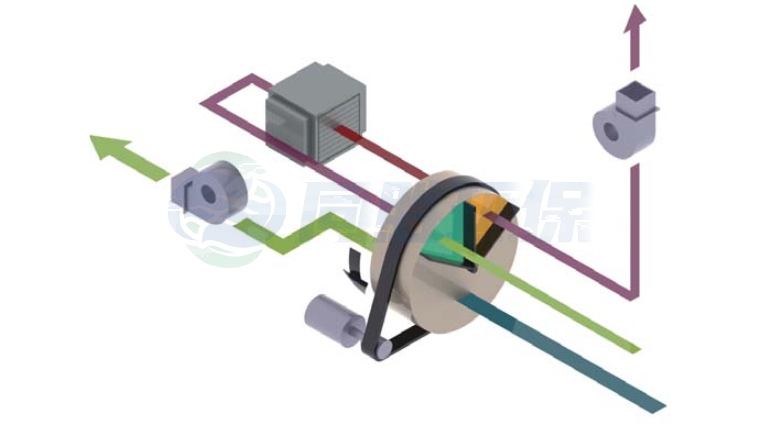 转轮浓缩机的浓缩转轮由沸石(Zeolite)分子筛为吸附材料,分子筛可过滤比空气分子大的有机物,而空气直接通过,有机物被分子筛吸附,废气得到净化后排入大气。分子筛转轮分为三个区域,即吸附处理区、再生区和冷却区。废气通过吸附处理区净化VOCs后达标排放,吸附了VOCs的再生区逆向通以少量热空气,将有机物吹脱出来。可根据具体需要浓缩5~25倍,浓缩后的有机废气可采用热氧化技术分解化成无害的CO2和H2O。系统运行一段时间后有机物分解释放的热量可维持分子筛再生,即达到再生过程热量平衡,极大地减少能耗。
